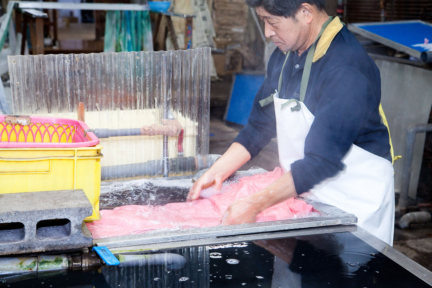 「洗い」では、専用の洗剤と刷毛を使用して汚れをこすり落とし、徹底的なすすぎを行うため、生地を傷めずに仕上げられます。その後、「張り」の工程では、生地のサイズや形を整えるために、糊付けをしながら乾燥を行います。