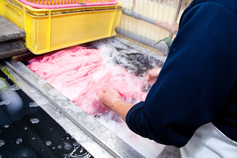 分解された汚れは、繊維を傷めないように専用ブラシを使い手作業で落とします。この工程が、洗い張りならではの丁寧なクリーニングです。